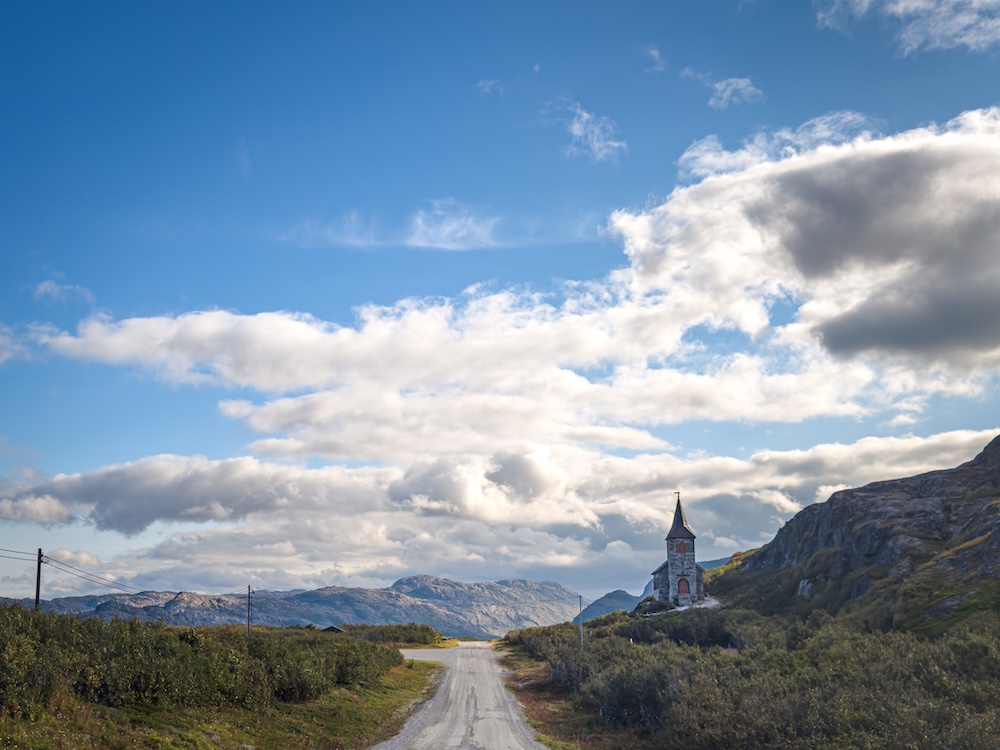 Dann weiten sich die beiden Gebirgszüge und das Delta des Jakobselv wird breiter. Ich fahre an den letzten leer stehenden Häusern vorbei und die Kirche ragt als winziger Punkt in dieser endlosen Landschaft auf einem hohen Felsen hervor.