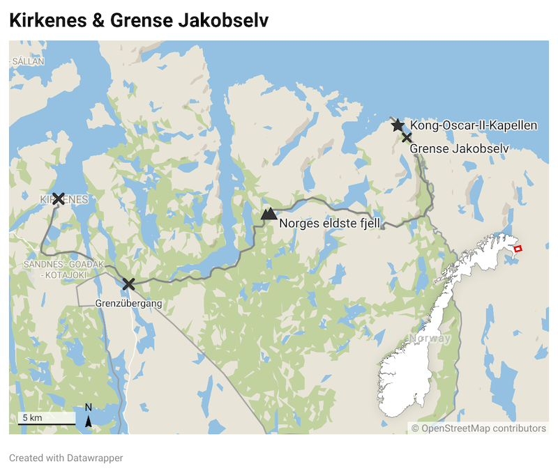- Der Parkplatz „Grense Jakobselv“ ist circa 60km und 1,5h Fahrtweg von Kirkenes entfernt