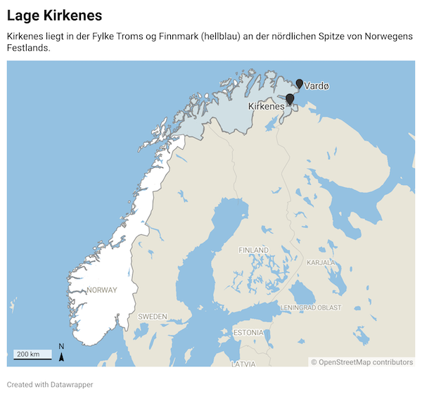 - Kirkenes und das Grenzgebiet sind zwar am nächsten zur russischen Grenze, aber die östlichste Gegend Norwegens ist es nicht. Die Stadt Vardø, die auf der nördlich gelegenen Halbinsel Varanger liegt, ist noch einen Breitengrad weiter im Osten.
